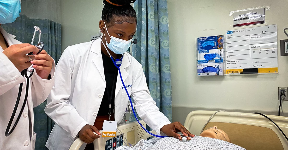 Mbeledogu, along with Banks and more than a dozen other participating students on the nursing track, got to engage with UCLA Nursing faculty and staff throughout the program. Students had the chance to visit the School of Nursing’s Skills & Simulation Lab and got up-close with a variety of simulated learning experiences.